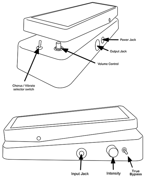 The Speed is controlled by the (foot) treadle, the Intensity control is located on the side, the Volume control is located under the treadle where it can't get "bumped" once you have it set to your exact preference, the Chorus/Vibrato switch is located on the top-front of the pedal, and a true bypass switch is located on the side so you dont have to unplug the pedal when it's not needed. With the exception of the additional true bypass switch, the Vibe-Baby CV-2TM circuit is built and sounds just like an original Uni-Vibe.